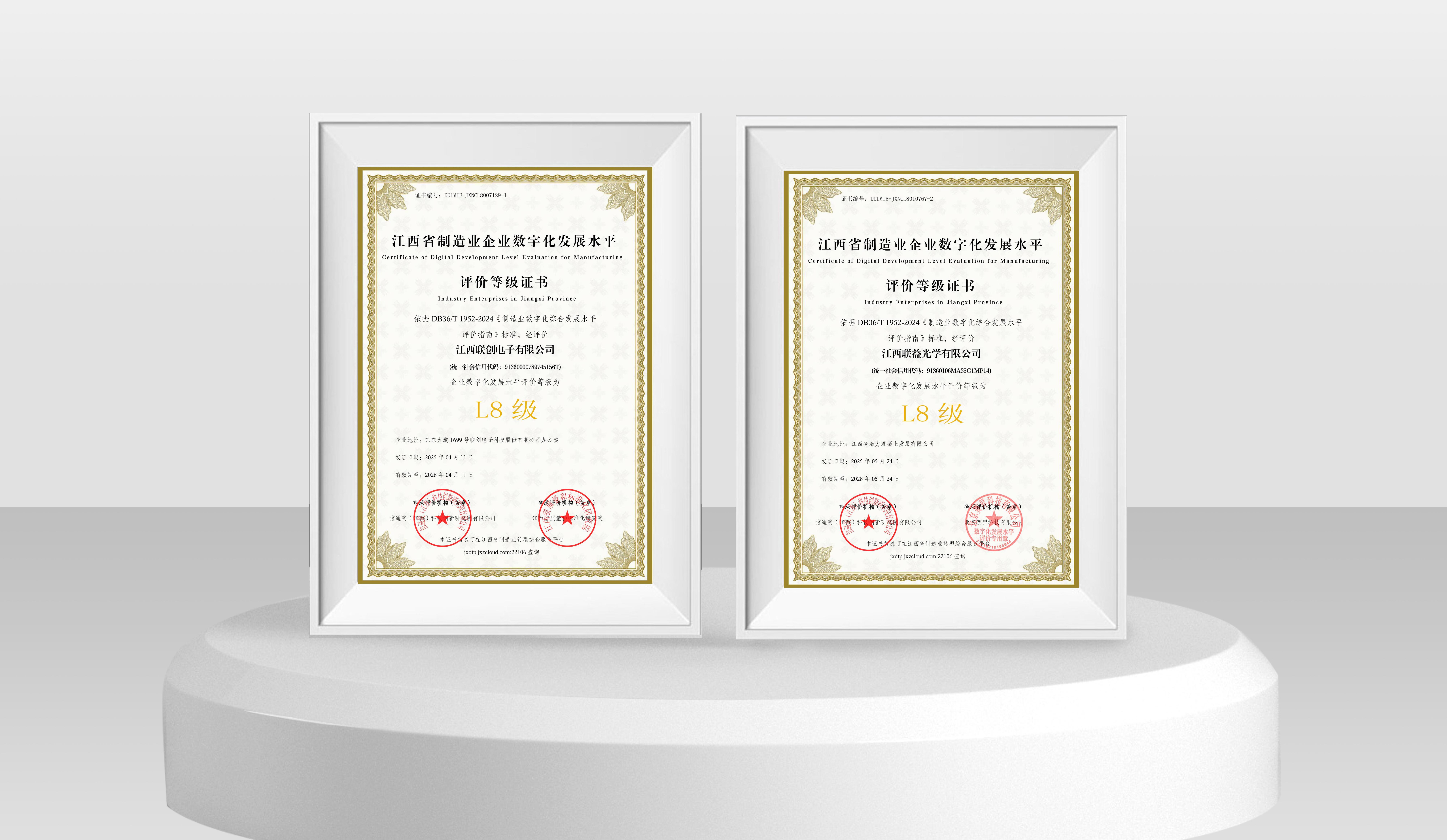 近日,乐竞网页版登录入口旗下江西联创电子有限公司(以下简称江西联创)与江西联益光学有限公司(以下简称江西联益)凭借深度集成与创新应用能力,在江西省制造业企业数字化发展水平等级评价中双双达到L8级水平,标志着两家企业在数字化转型领域已跻身全省“集成提升阶段”最高水平,为全省制造业智能化升级树立新标杆。